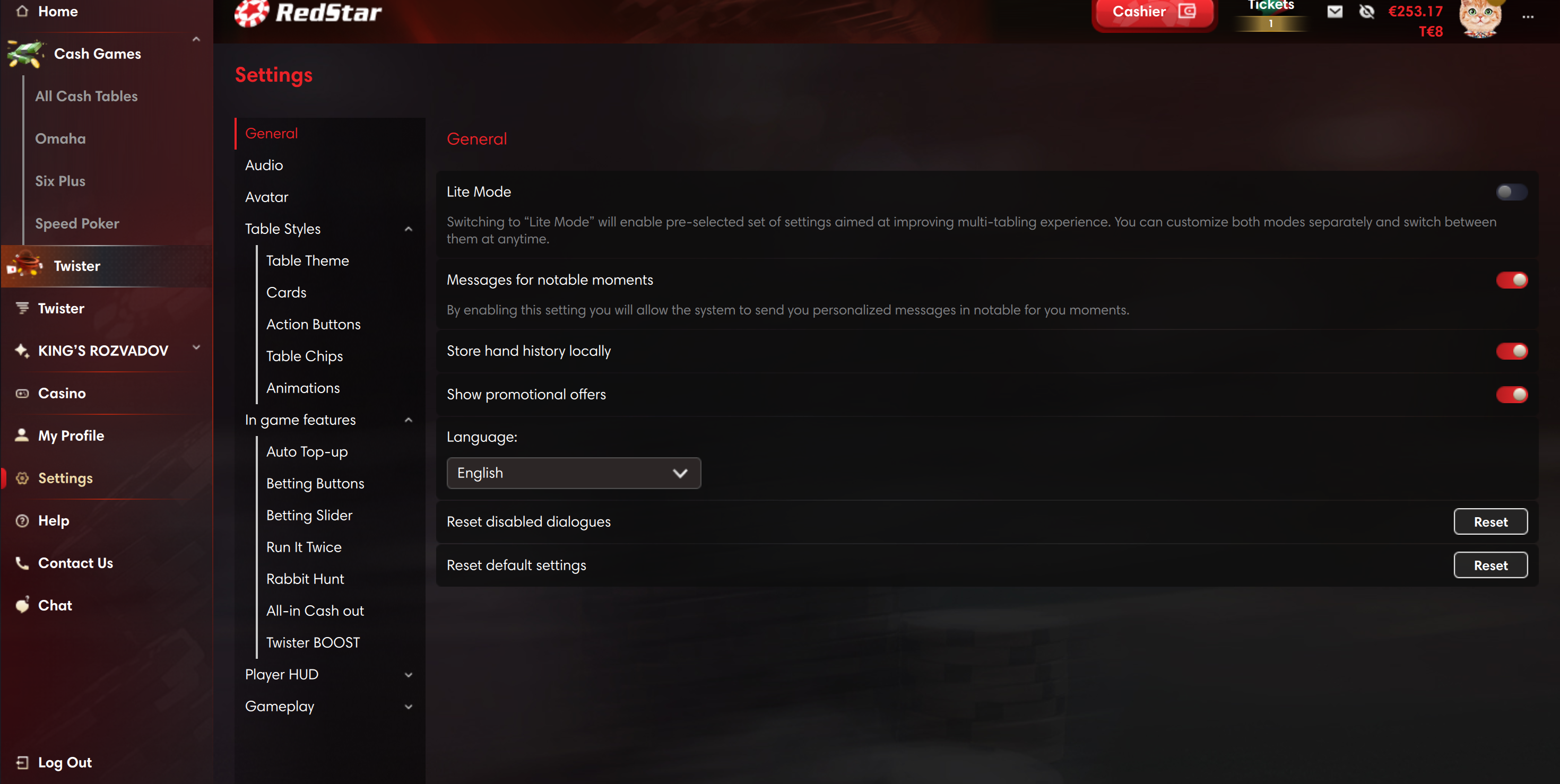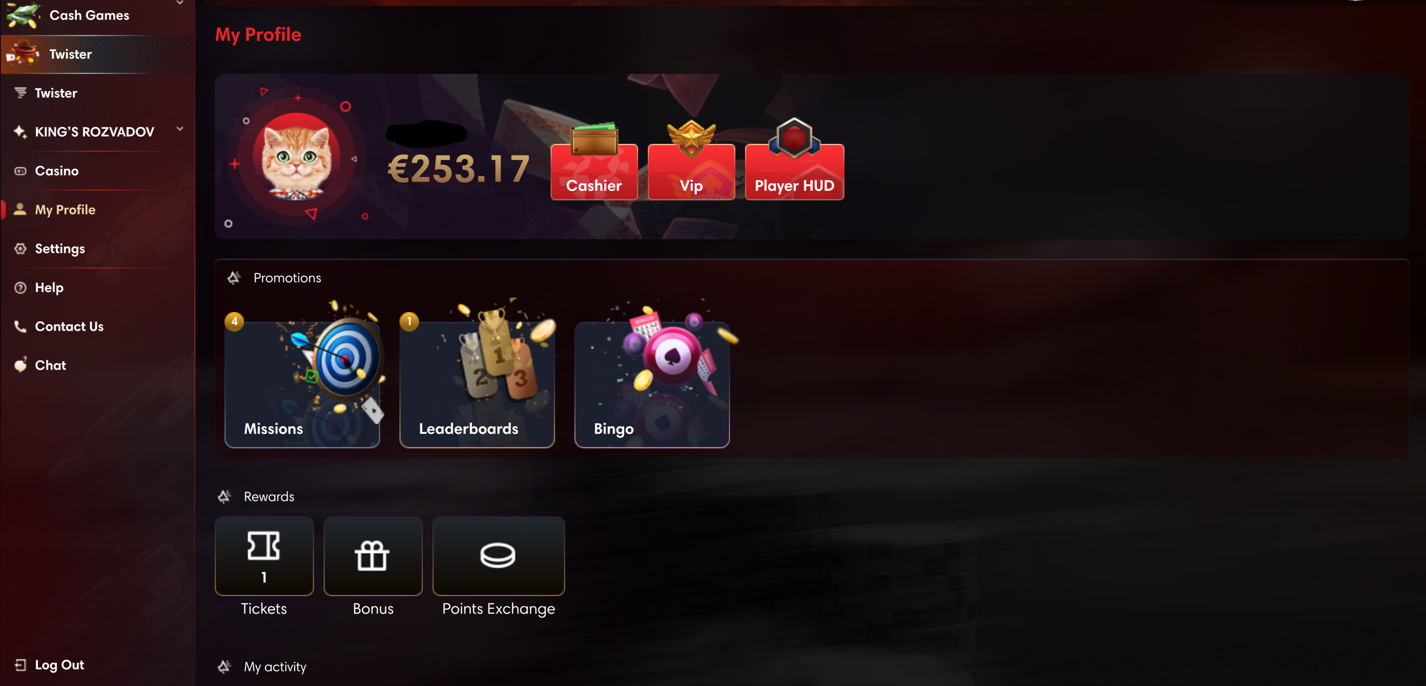 Раздел Мой профиль включает доступ к Кассиру, информацию о текущем Вип-уровне и отслеживании прогресса, настройки HUD, доступ к текущим миссиям и лидербордам, а также Бинго картам. Ниже есть соответствующие кнопки для просмотра полученных билетов, статусных очков (и их обмена), и покерных бонусов. С этой же вкладки открывается доступ к истории игр, списку текущих турниров (нынешних и предстоящих).