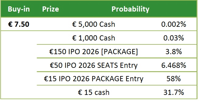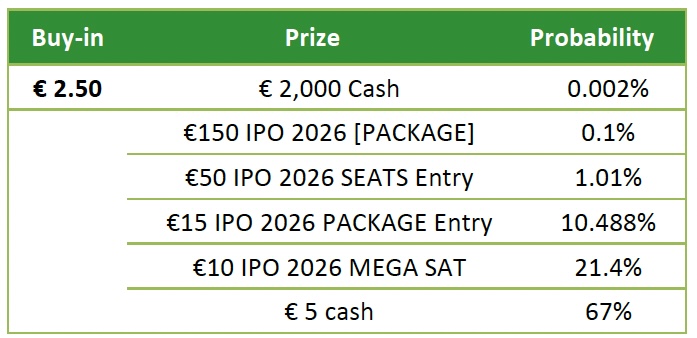 - Билеты “€15 IPO 2026 PACKAGE Entry”, “€50 IPO 2026 SEATS Entry” и “€150 IPO 2026