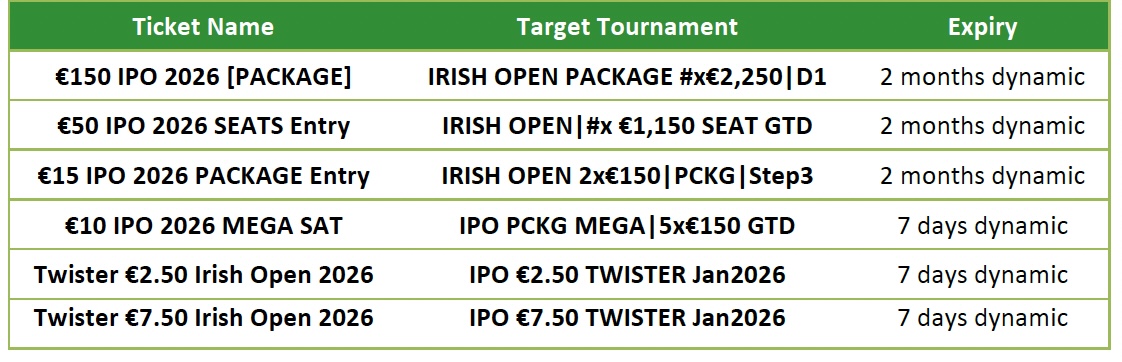 - Выигранные билеты “€15 IPO 2026 PACKAGE Entry” могут быть использованы на любые турниры “IRISH OPEN 2x€150|PCKG|Step3“, бай-ин €15, которые состоятся с 16 января 2026 до 22 марта 2026.