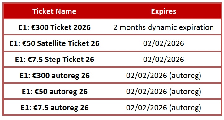 - Билеты “E1: €7.5 Step Ticket 26”, “E1: €50 Satellite Ticket 26 “ и “E1: €XX autoreg 26” действуют до 02/02/2026. Билеты “E1: €300 Ticket 26“ действуют 2 месяца после выдачи. После окончания промо данные билеты могут быть использованы на любые турниры до истечения их срока действия.