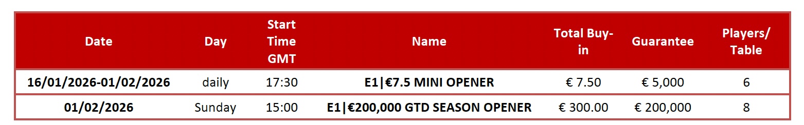 - основное событие €200,000 GTD, бай-ин €300 (“E1|€200,000 GTD SEASON OPENER”) - состоится 01/02/2026